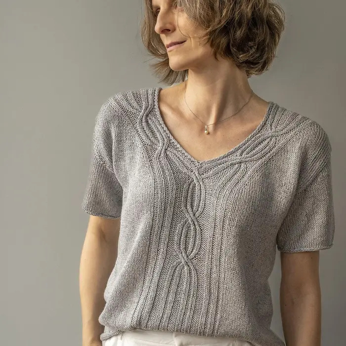 Топ Sylvan Tee вяжется сверху вниз полностью без швов. Конструкция модифицированного спущенного плеча и европейского плечевого шва (он же носит название японское плечо), который отходит от естественной линии плеча, обеспечивают наилучшую посадку. Топ вяжется как поворотными рядами, так и по кругу.