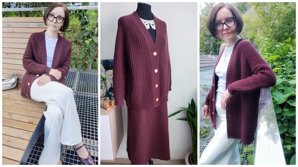 Конструкция - реглан сверху без швов, планка вяжется от полочек. Прибавки от регланных линий и вдоль горловины спускаются красивым каскадом по кардигану, а полупатентная резинка дает объем и фактуру этой базовой модели.