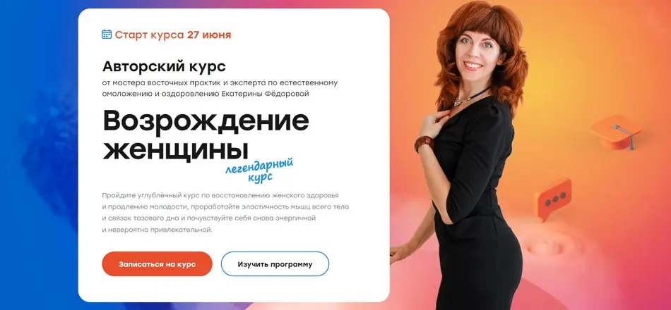 Автор курса занимается реабилитацией и оздоровлением более 20 лет. Екатерина Фёдорова ярко доказывает действенность всех знаний, которыми делится, на собственном примере. Это отсутствие хронических болезней в 53 года, прекрасная осанка, здоровое тело, море энергии и исключительная харизма.