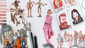 Рисуем понятные и простые схемы, которые станут прекрасной базой для любого скетча с человеком. Привыкаем к пропорциям и характерным движениям человека на безопасной натуре: деревянных человечках и манекенах. Попутно рисуем разные ткани и касаемся fashion-стилизации в скетчинге. Привыкнув к пропорциям и собрав богатую палитру готовых “телесных” цветов и смесей, нарисуем целый разворот с настоящими людьми и большой изящный скетч-иллюстрацию. Блок завершается яркой зарисовкой целой музыкальной группы в городской среде.