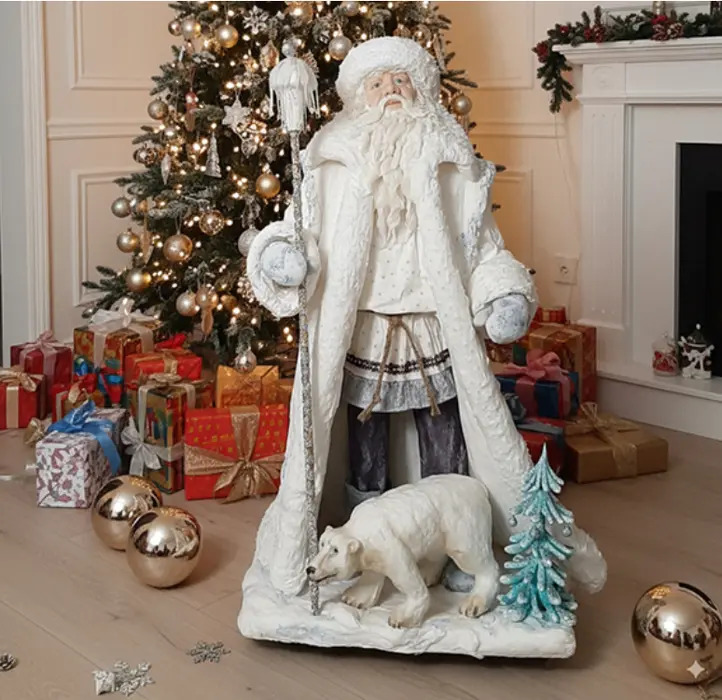 Его шуба искрится, словно снег под зимним солнцем, а рядом шагает белый медведь – будто кадр из настоящей русской сказки.