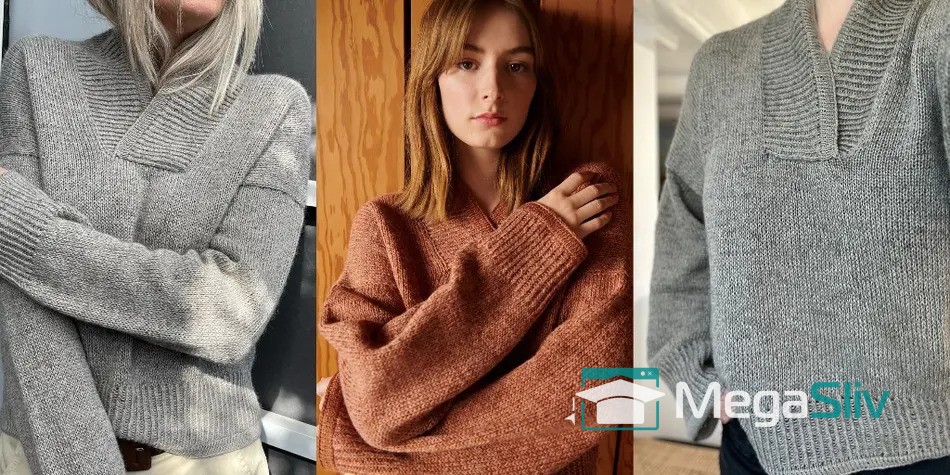 Стильный пуловер с шалевым воротником и японским плечом, вязаный спицами сверху.
