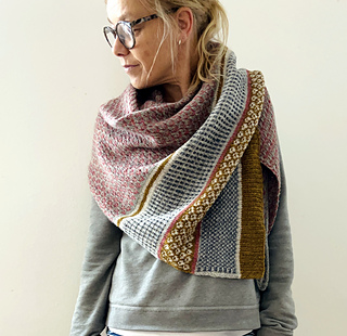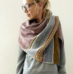 SSP вяжется платочной вязкой (в изнаночном направлении), с прибавлением петель по одному краю для создания асимметричного треугольника. Петли прибавляются в изнаночном узоре, а затем переходят в резинку 1х1. Вязаный край и цветная изнаночная вязка (в каждом ряду вы работаете только с одним цветом) станут идеальным началом для изучения цветной изнаночной вязки (обещаем — вам будет очень весело!). Сочетание простых узоров изнаночной вязки и широкой резинки придает этой шали изысканный, но в то же время непринужденный вид.