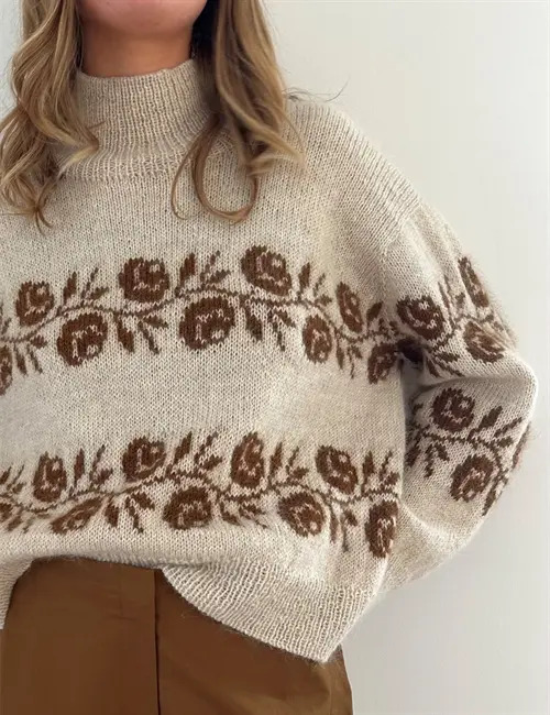 Rosie Sweater har to rosenborter på krop og ærmer, og den snedige konstruktion er en kombination af ærmekuppel og raglan, som betyder at al mønster kan strikkes rundt fra retsiden.