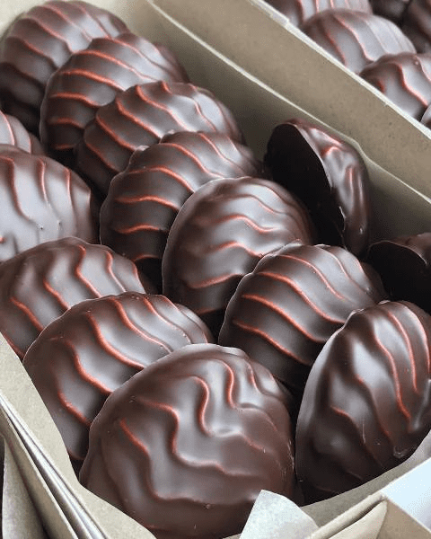 Зефир в шоколаде, покоривший много сердец. Внутри с кислинкой (и неважно из какой ягоды, малина, вишня, красная или чёрная смородина), а сверху деликатная шоколадная горчинка. Слой шоколада настолько тонкий, что просвечивает рёбра формы.