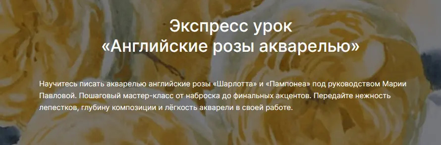 Этот мастер-класс Марии Павловой посвящён акварельной живописи английских роз — утончённых сортов «Шарлотта» и «Помпонелла». Художница шаг за шагом показывает, как из лёгкого наброска рождается воздушный акварельный букет: как выстроить композицию, передать глубину формы и нежность оттенков.