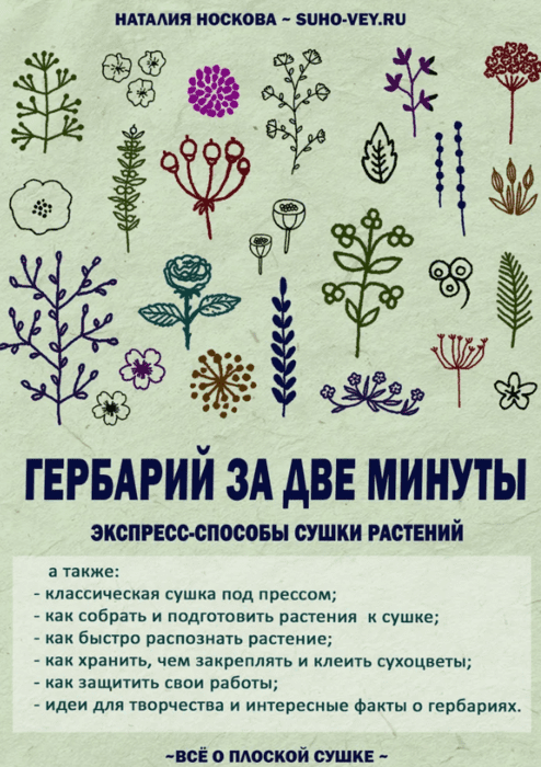 В моем пособии я рассказываю об экспресс и классических методах сушки, даю рекомендации по сбору, подготовке растений и хранению сухоцветов, показываю чем клеить и закреплять, а также как защитить работы с сухоцветами.