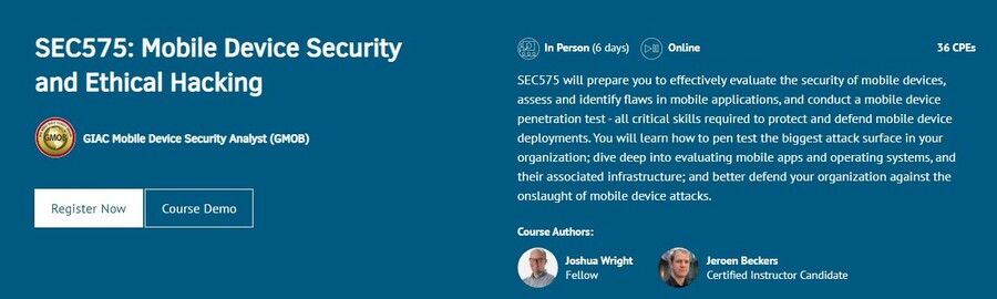 SEC575: Mobile Device Security and Ethical Hacking is designed to give you the skills to understand the security strengths and weaknesses of Apple iOS and Android devices. Mobile devices are no longer a convenience technology - they are an essential tool carried or worn by users worldwide, often displacing conventional computers for everyday enterprise data needs. You can see this trend in corporations, hospitals, banks, schools, and retail stores across the world. Users rely on mobile devices today more than ever before -- we know it, and the bad guys do too. The SEC575 course examines the full gamut of these devices.