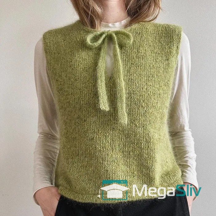 Название: Укороченная безрукавка с бантом на горловине Obsidian, вязанная спицами сверху (2025)