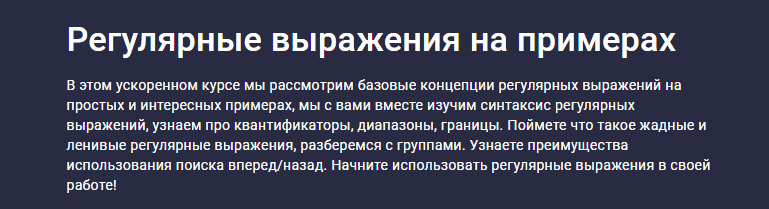 В этом курсе показано множество примеров, которые помогут запомнить изучаемый материал. В результате вы сможете писать и читать регулярные выражения для любого языка программирования и для разных текстовых сред. Если у вас есть предварительные знания о регулярных выражениях или если вы совсем новичок, вы попали в нужное место. Наш курс научит вас выполнять регулярные выражения с нуля.