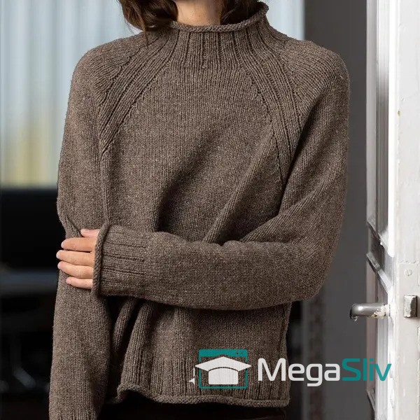 Свитер P1 – простой свитер в стиле унисекс с высоким воротником-стойкой. Свитер вяжется без швов, сверху вниз. В начале работы выполняется высокий воротник-стойка, затем укороченными рядами формируется линия горловины спинки (росток). После круговыми рядами вяжется кокетка с прибавками для линий реглана.