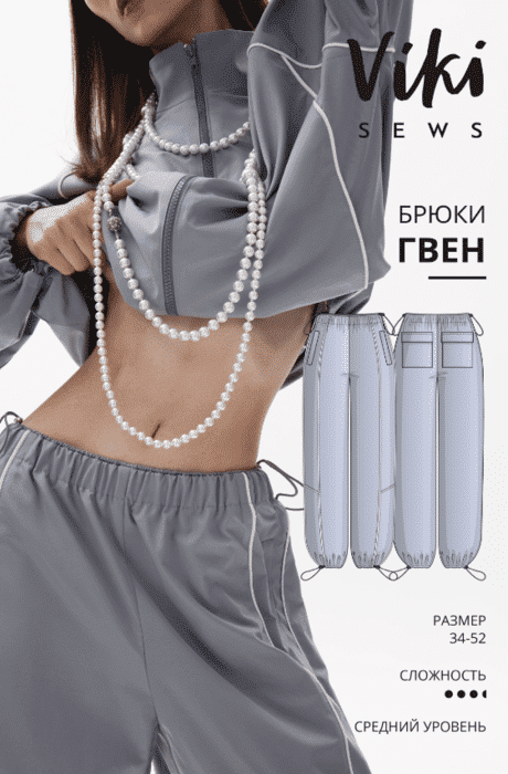 Выкройка брюк большого объема, прямого силуэта. Линия талии занижена на 6 см. Верхний срез оформлен кулиской, обработанный обтачкой, в которую вставлена эластичная тесьма (резинка), и притачной бейкой, в которую вставлен эластичный шнур, регулируемый по боковым швам фиксаторами. На передней половинке карманы с листочками с втачными концами на молнии. На задней половинке накладные карманы с клапанами на ленте велкро. Боковой шов и фигурные подрезы оформлены кантом и отделочной строчкой. Низ брюк также оформлен кулиской, в которую вставлен эластичный шнур с фиксатором. Длина брюк до щиколотки.