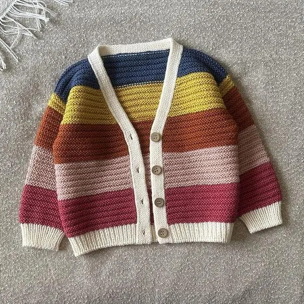 Симпатичный стильный кардиган для девочек вяжется спицами цветными полосами фактурным узором сверху вниз.