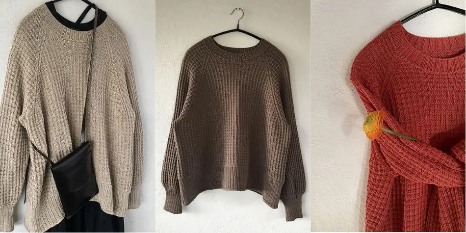 Сначала вязать поворотными рядами для формирования ростка, затем вязать по кругу вафельным узором. На уровне пройм отделить рукава и продолжать корпус. Затем вернуться к отложенным петлям рукавов и вязать их по кругу вниз. Рукав может быть узкий или широкий, согласно вашим предпочтениям, инструкции содержат указания.