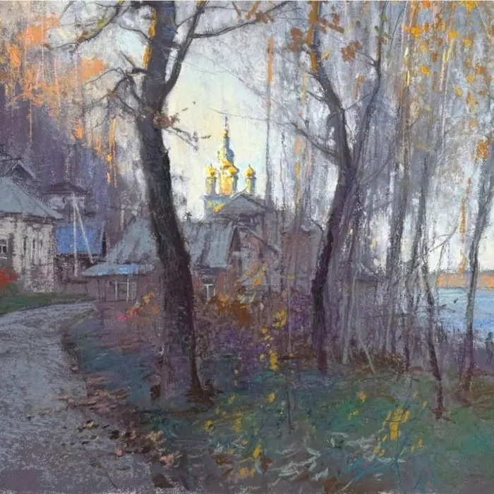 В основной части эфира окунёмся в левитановскую осень в Плёсе. Напишем лучи «золотого часа», пробивающиеся сквозь кроны деревьев, проследим движение луча слева направо. Посмотрим внимательно на тональное отношение освещённых и теневых частей работы. Поработаем над свето-воздушной перспективой и плановостью. Уделим внимание рисунку деревьев и попробуем передать небо через ветки.
