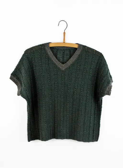 Тонкая блуза свободного фасона с коротким рукавом а-ля футболка может быть связана из летней пряжи, смесовки льна, хлопка, шелка или бамбука.